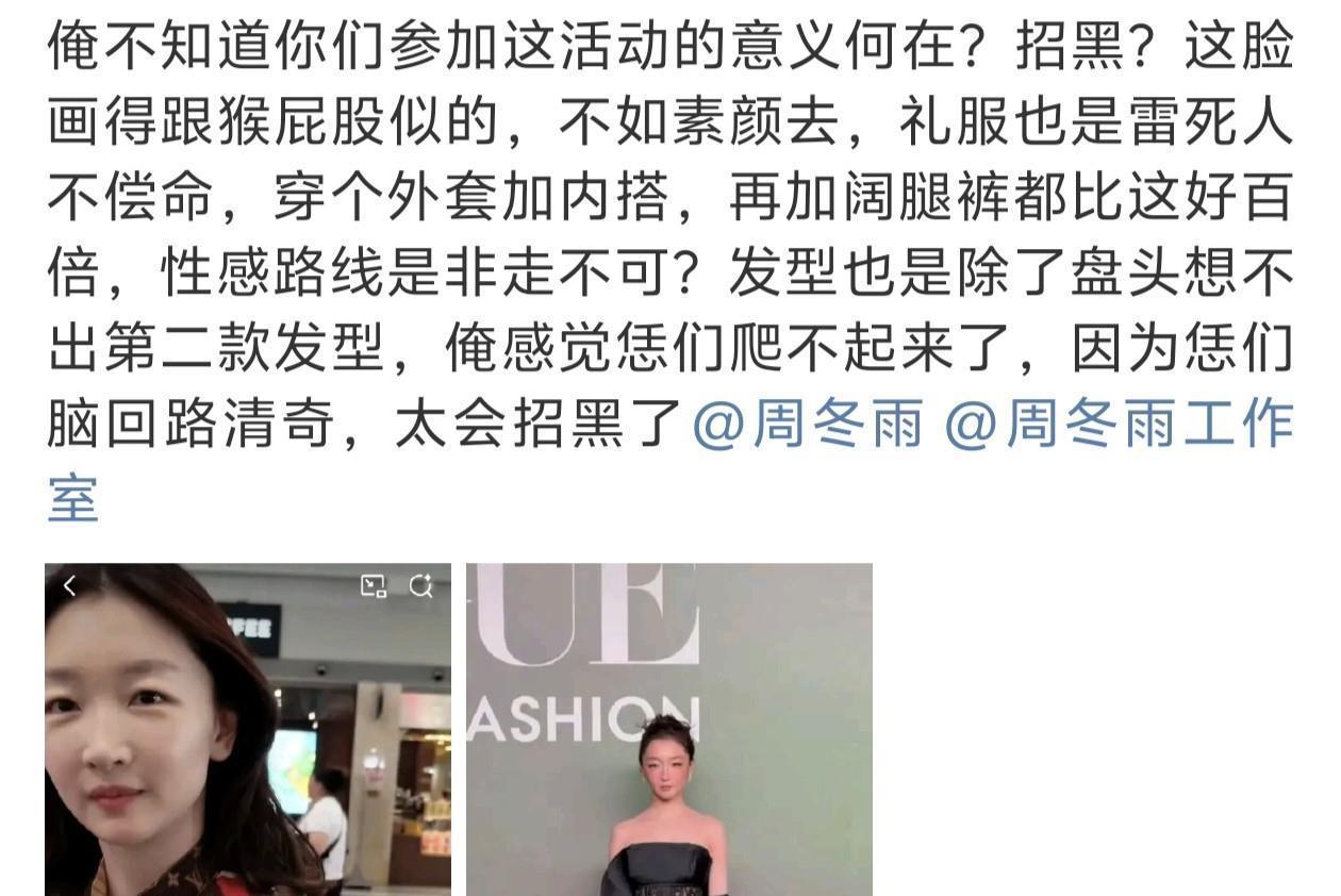 就在网友纷纷夸赞女明星这次的妆造各有各的美丽,可谓是百花齐放的时候,有三位女明星出来却让大众眼前一黑,纷纷区工作室声讨是谁做的造型。第一位便是周冬雨。真的有人可以欣赏这种衣服嘛?
